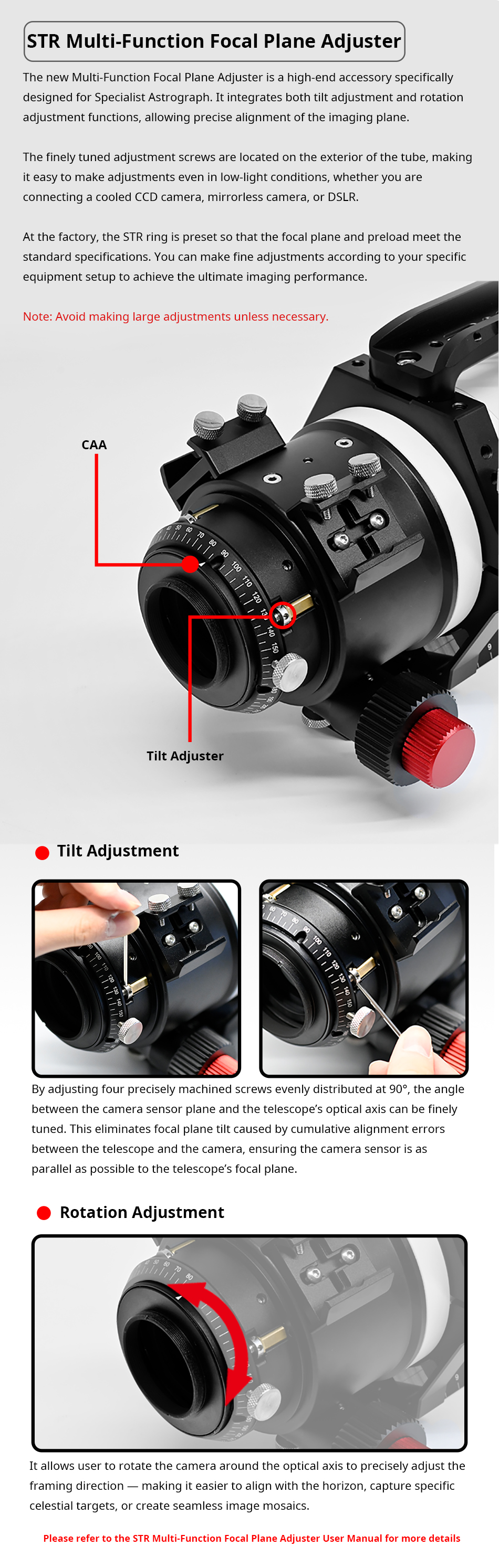 Meccanica di altissima qualità con preciso rotatore graduato e tilter di precisione che può essere regolato anche con tutto il treno ottico montato